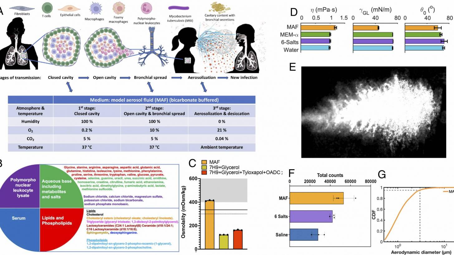 They devised a fluid that mimics TB lesions, found that it protects Mtb from transmission-related stresses, associated this with the structure of the droplets as they dry and their ability to retain water, and used it to query the potential contribution of each of Mtb's genes to Mtb's survival in models of three sequential stages of transmission.