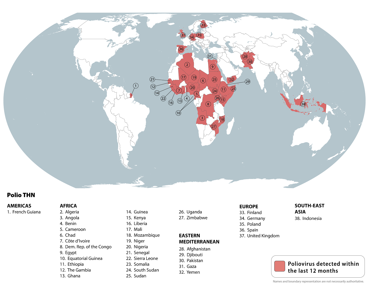 As of April 2025, the CDC identified 38 countries reporting poliovirus detections.